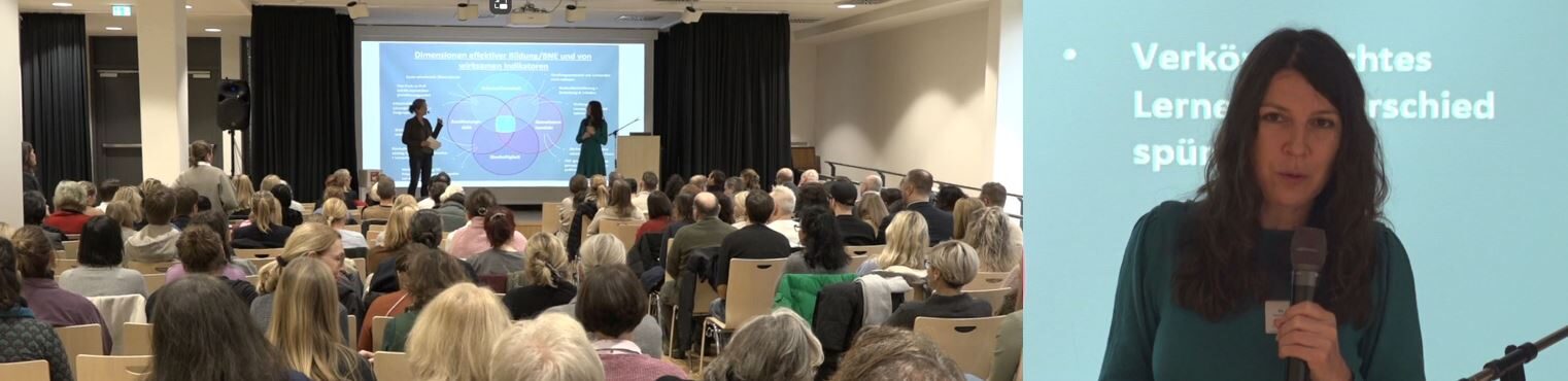 Dr. Antje Brock beleuchtete unter anderem die Planetary Health Checks, stellte die sogenannten „Pollution Pods“ vor, in denen man die Luftqualität, Gerüche und Temperaturen von Städten wie Neu-Delhi, São Paulo, Beijing, London oder Trondheim direkt erleben kann, erklärte, wie Ernährung als zentraler Hebel Veränderung bewirken kann, befasste sich mit der Frage „Was bewegt Menschen tatsächlich zu anderem Handeln? Welchen Effekt hat Wissen wirklich?“ und kam zu dem Schluss, dass Bewusstsein allein nicht ausreicht, sondern reale Handlungsoptionen wichtig sind. Sie erläuterte den Whole Institution Approach als ganzheitliches Bildungskonzept. Dort, wo Nachhaltigkeit sichtbar gelebt wird und sich an unterschiedlichen Stellen der Institution zeigt, sind Motivation und das Gefühl von Empowerment deutlich höher. Die Referentin stellte dar, dass in den letzten Jahrhunderten hochgradig intergenerationell und ohne schlechte Absichten versucht worden sei, eine „gute Moderne“ zu schaffen. Dabei konnte das menschliche Wohlbefinden erheblich gesteigert werden, allerdings auf Kosten der planetaren Gesundheit. Heute befinden wir uns an einem Punkt, an dem das menschliche Wohlbefinden weiter erhöht werden soll, ohne die planetaren Grenzen weiter zu überschreiten. Ein entscheidender Unterschied liege bei Zielen und Transformationsprozessen darin, wie Ziele formuliert seien. Nachhaltigkeitsthemen sind häufig stark von Avoidance geprägt („Die Lage ist schlecht, wir müssen da irgendwie raus“). Wirksamer sind jedoch Approach-Strategien, die positive Zielbilder und Pull-Effekte erzeugen, wie etwa durch nachhaltige Ernährung.