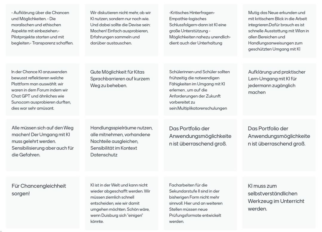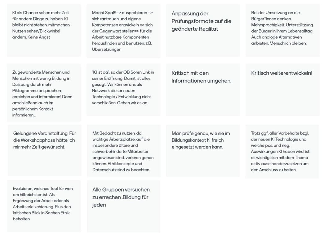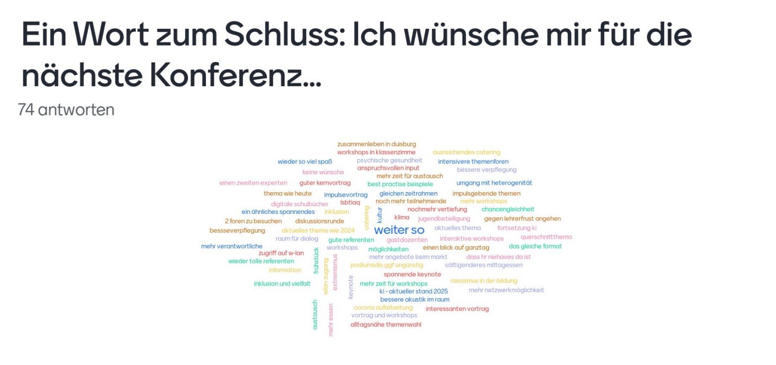 Wir danken allen, die sich an der Mentimeterabfrage beteiligt haben, für ihr Feedback! Mit 100 Teilnehmenden haben wir eine sehr gute Resonanz erhalten. Ihre Handlungsempfehlungen werden im Resümee zur Konferenz dem Lenkungskreis der Bildungsregion vorgestellt und bei der Arbeit der Handlungsforen der Bildungsregion berücksichtigt.