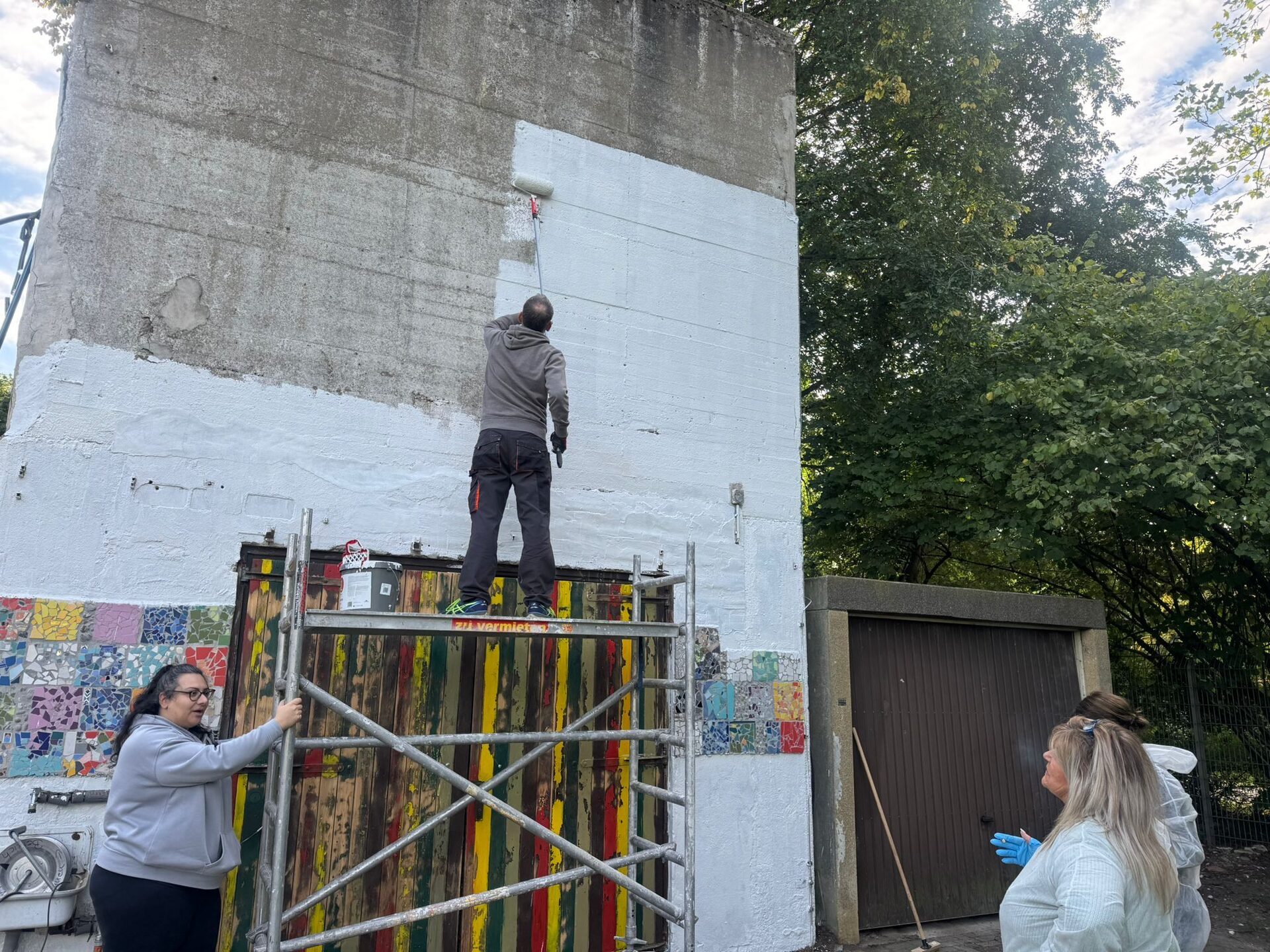 Ein besonderer Schwerpunkt lag auf der alten Bunkerwand, die von einem Team von zehn Personen sorgfältig gereinigt und grundiert wurde. Die Fläche soll künftig als kreative Leinwand für die Kinder und Jugendlichen dienen, die dort eigene Kunstwerke gestalten können. Unter anderem wurde auch eine weitere Hütte grundiert.