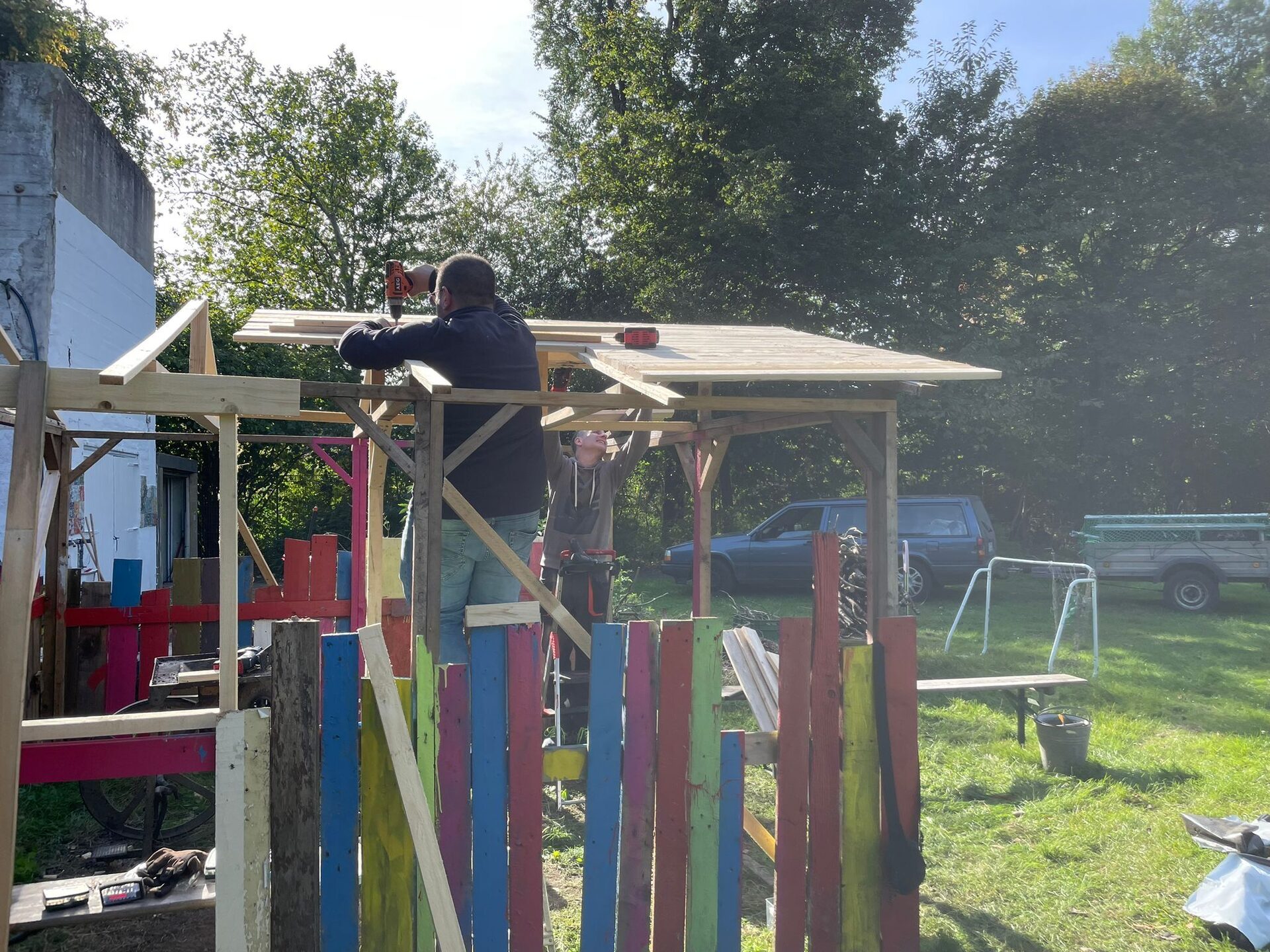 Währenddessen machte sich eine andere Gruppe Helferinnen und Helfern daran, die „Villa Kunterbunt“ bzw. das Schmiedehaus weiter auszubauen. Mit Holzverbretterungen, dem Einbau von Fenstern und Türen sowie der Stabilisierung des Daches wurde die Hütte deutlich robuster und einladender.