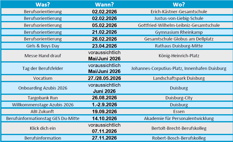 Auf Messen und anderen Infoveranstaltungen hast du die Möglichkeit, mehr über die Ausbildungsberufe, das vielfältige Arbeiten bei der Stadt Duisburg und das Bewerbungs- und Auswahlverfahren zu erfahren. Komm doch auch und informiere dich!