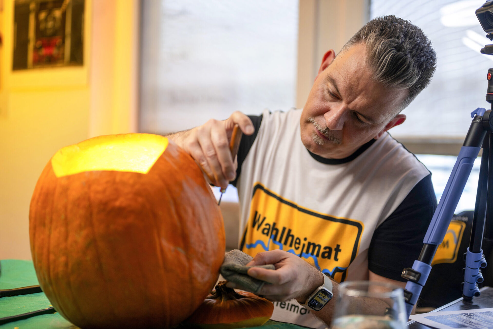 Mit seinem Halloween-Hobby hat er auch seine Frau Gerlinde und die beiden 17- und 21-jährigen Kinder angesteckt. Während Gerlinde vornehmlich Gemälde-Klassiker kopiert, sind die Kids eher im Marvel- oder Gaming-Universum unterwegs. „Mir gehen die Motive jedenfalls nicht aus“, schmunzelt Danny Gießner. In seiner Freizeit erkundet er das Revier, fotografiert Wahrzeichen und Landmarken. Eines seiner Bilder wird dann jedes Jahr die Vorlage für den Kürbis.