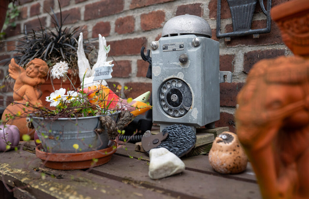 Die Stadt Duisburg kaufte die Häuser 1979 und setzte 1984 eine neugegründete Genossenschaft ein, die noch heute die 403 verbliebenen Wohnungen verwaltet. Die Siedlung Rheinpreußen mit ihren schmucken Backstein-Fassaden, den dunkelgrünen Dachumrahmungen, den großen Platanen-Alleen, ja der insgesamt „very british“ anmutenden Gestaltung war gerettet. Und mit ihr eine Gemeinschaft, die noch stärker zusammengewachsen war. „Hier hilft jeder jedem“, betont Wolfgang Hering. „Wir rufen nicht sofort den Handwerker, wir packen selber an.“ Hering hat selbst noch Pütt-Vergangenheit, war als Maschinenschlosser bei der Ruhrkohle beschäftigt. „Das habe ich damals mitgenommen“, sagt er und zeigt auf ein altes Bergwerkstelefon, das er dekorativ zwischen Blumen und Skulpturen neben der Eingangstür platziert hat.