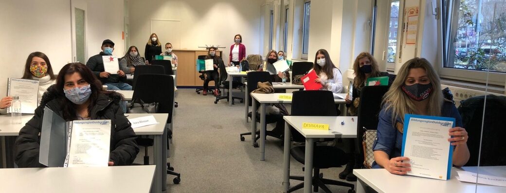 „Ich werde weiterlernen“, sagt Anka Yordanova, „denn schließlich bin ich ein Vorbild.“ Stolz hält die gebürtige Bulgarin ihre Teilnahmebescheinigung in die Kamera. 21 Menschen aus Rumänien und Bulgarien, Roma und Nichtroma haben gemeinsam an der Qualifizierungsreihe des Projektes: „Vorbild sein - Vertrauen schaffen“ teilgenommen. Initiiert wurde das Projekt unter der Federführung des Büros Bildungsregion der Stadt Duisburg gemeinsam mit dem Arbeitskreis Chancen für SOE –Duisburger*innen.