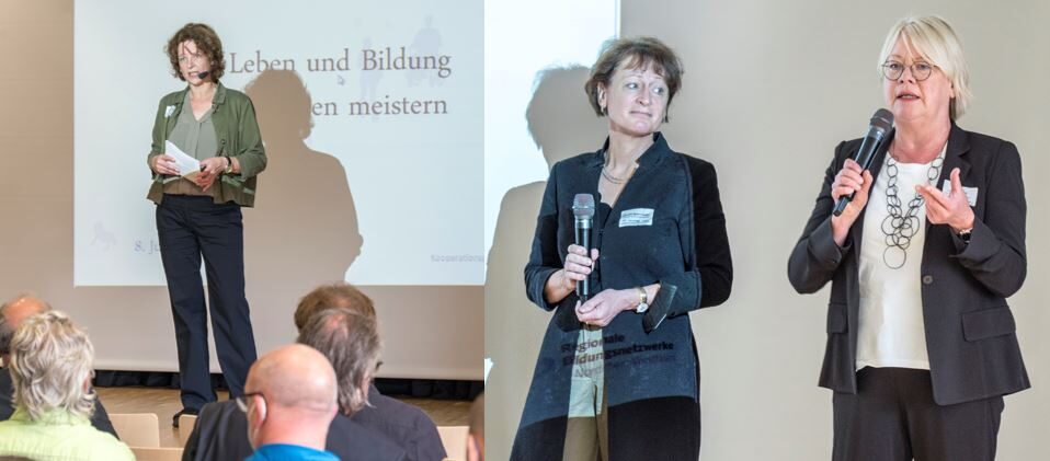 Im Kurzinterview erörterte Moderatorin Edda Dammmüller mit Astrid Neese, Beigeordnete für Bildung, Arbeit und Soziales der Stadt Duisburg, und Annette Quent-Langer vom Schulamt für die Stadt Duisburg Fragen zum Thema „Bildungsnetzwerke in herausfordernden Zeiten“.