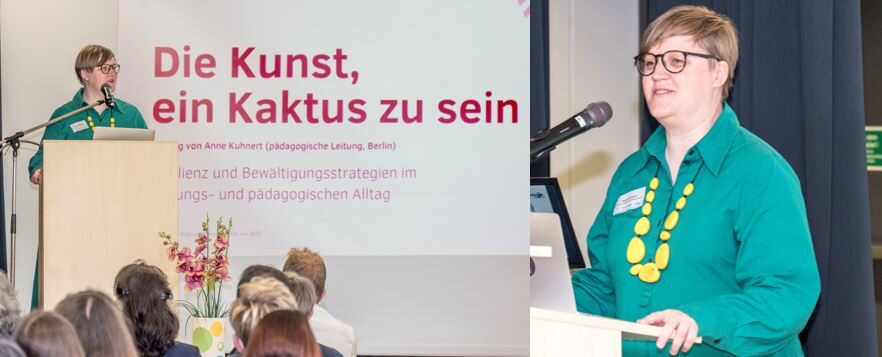 Anne Kuhnert, Institut für digitale Pädagogik Berlin, befasste sich in ihrer Keynote "Die Kunst, ein Kaktus zu sein" mit dem Thema Resilienz und erläuterte Bewältigungsstrategien für den Bildungs- und pädagogischen Alltag.