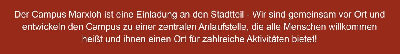 Im Campus Marxloh sind alle Menschen aus dem Stadtteil willkommen und der Ort soll zu einer beliebten Anlaufstelle im Stadtteil werden. Campus Marxloh wird verschiedenen Organisationen aus dem Stadtteil neuen, gemeinsamen Räumlichkeiten bieten, so dass viele unterschiedlichen Angebote unter einem Dach gebündelt werden können. Weitere Informationen zu dem Profil und den zukünftigen Angeboten finden Sie hier (Verlinkung Unterseite „Profil und Angebote“).