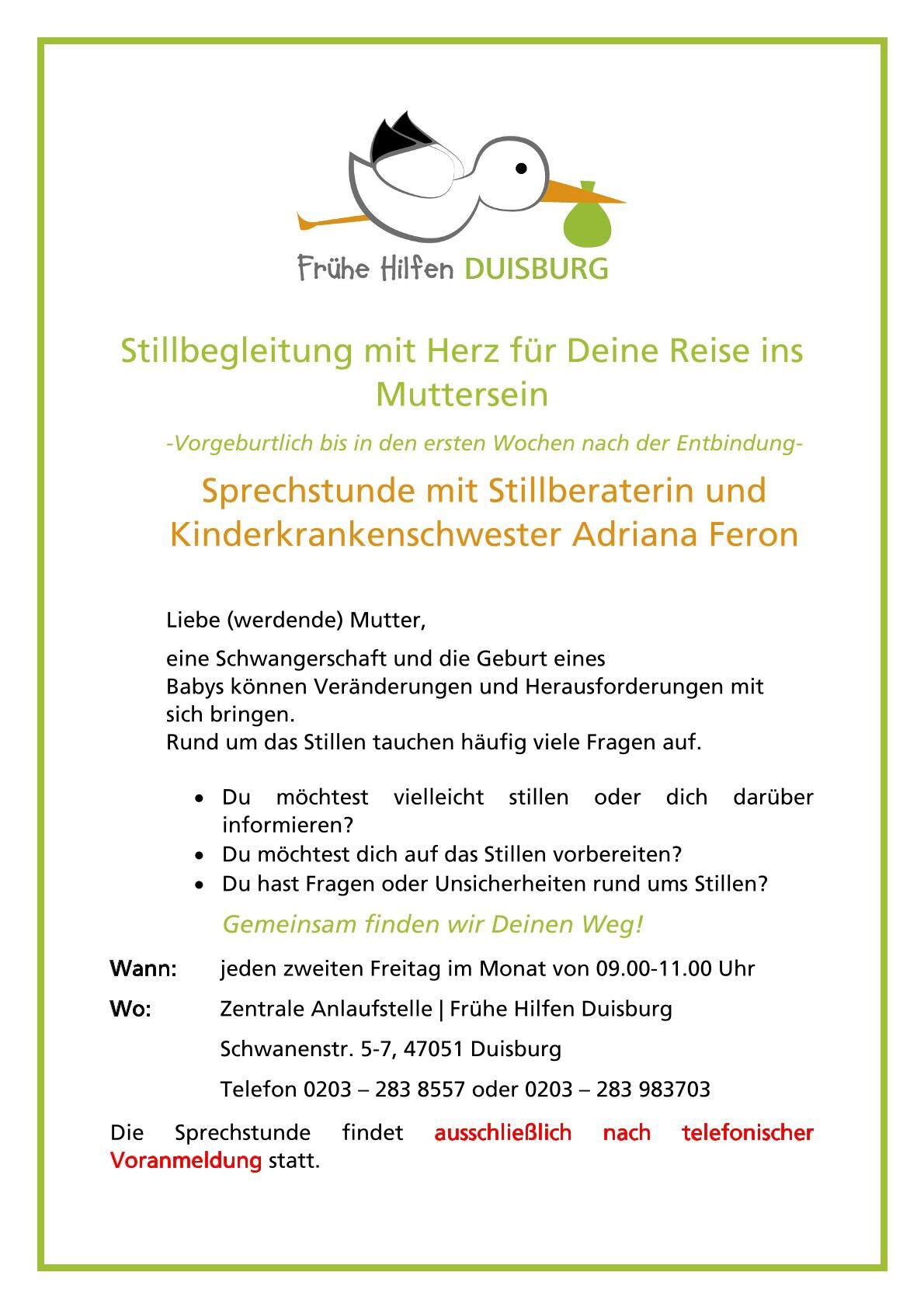 Wann: Jeden zweiten Freitag im Monat Wo: Zentrale Anlaufstelle Frühe Hilfen, Schwanenstr. 5-7 (Eingang Steinsche Gasse 2), 47051 Duisburg Die Sprechstunde findet ausschließlich nach telefonischer Voranmeldung statt. |