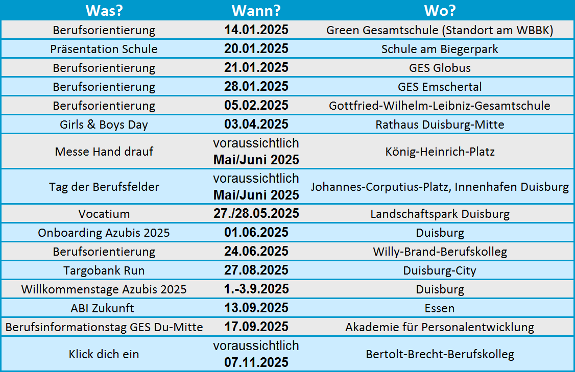 Auf Messen und anderen Infoveranstaltungen hast du die Möglichkeit, mehr über die Ausbildungsberufe, das vielfältige Arbeiten bei der Stadt Duisburg und das Bewerbungs- und Auswahlverfahren zu erfahren. Komm doch auch und informiere dich!
