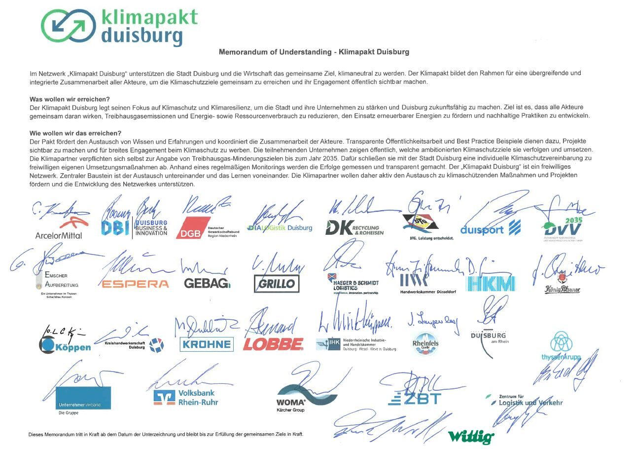 Im Netzwerk „Klimapakt Duisburg“ unterstützen die Stadt Duisburg und die Wirtschaft das gemeinsame Ziel, klimaneutral zu werden. Der Klimapakt bildet den Rahmen für eine übergreifende und integrierte Zusammenarbeit aller Akteure, um die Klimaschutzziele gemeinsam zu erreichen und ihr Engagement öffentlich sichtbar machen.