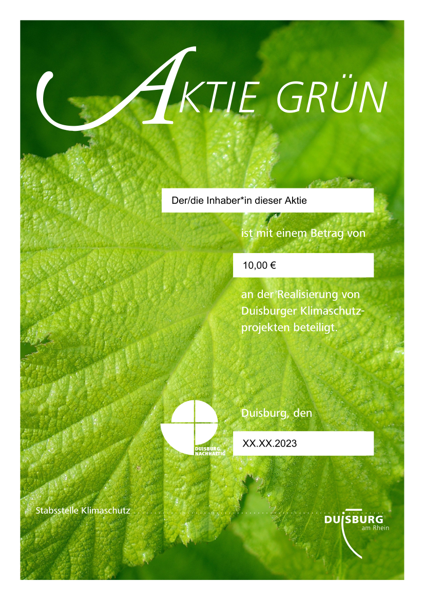 Bitte beachten Sie, dass Sie mit der Aktie kein Aktionärsrecht erwerben, weil es sich nicht um eine Aktie im Sinne des Aktienrechts handelt. Mit dem Kauf der Aktie tragen Sie vielmehr zur Realisierung von Grünprojekten in der Stadt Duisburg bei und leisten einen wichtigen Beitrag zur Verbesserung der CO2-Bilanz und somit zum Klimaschutz und dies krisensicher und dauerhaft.