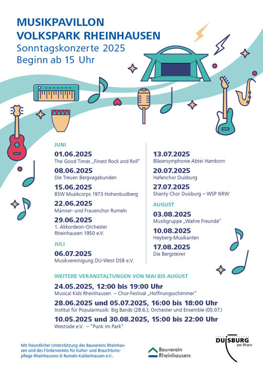 Das Kulturbüro der Stadt Duisburg setzt in diesem Jahr, mit freundlicher Unterstützung des Bauvereins Rheinhausen und des Fördervereins für Kultur-und Brauchtumspflege Rheinhausen & Runmeln Kaldenhausen, wieder zwölf Konzerte um.