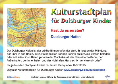 Ob im Klassenzimmer oder beim Unterrichtsgang: Mit dem Kulturstadtplan lässt sich vieles über Duisburg lernen. Ergänzend zum OnlineStadtplan und den Karten gibt es unterschiedliche Materialien für Kindergärten und die Klassen 1-5.