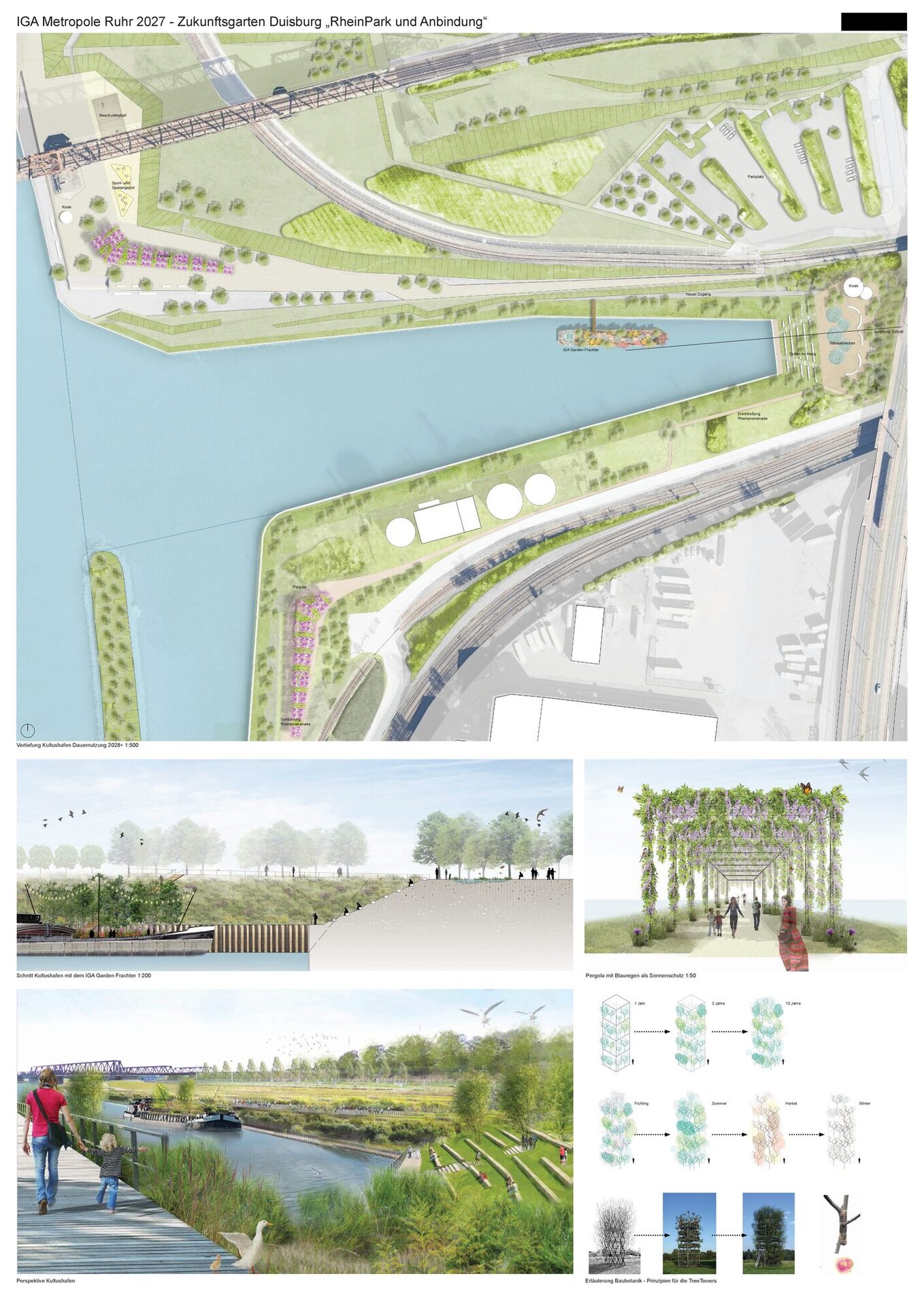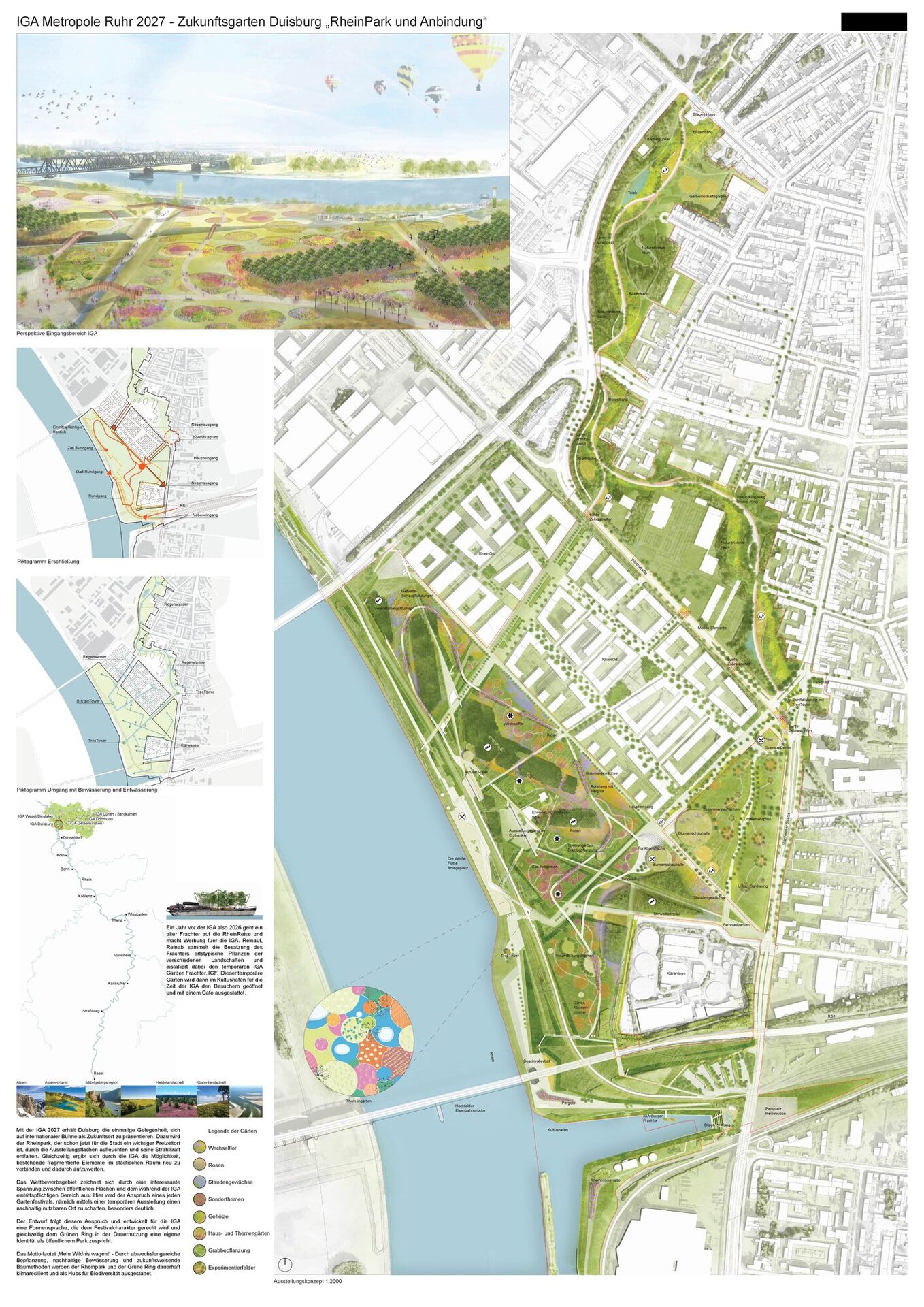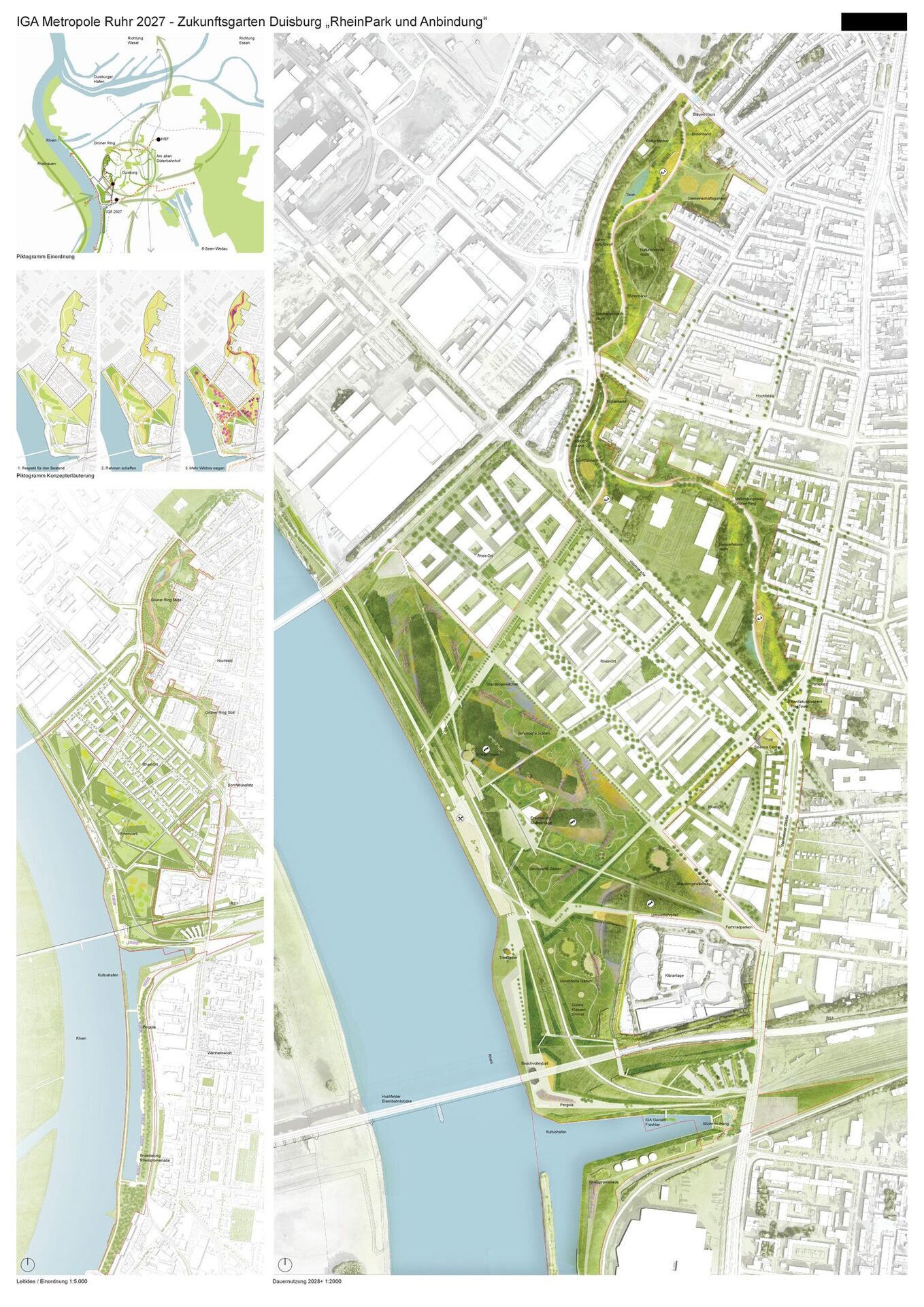 Mit der IGA 2027 erhält Duisburg die einmalige Gelegenheit, sich auf internationaler Bühne als Zukunftsort zu präsentieren. Dazu wird der Rheinpark, der schon jetzt für die Stadt ein wichtiger Freizeitort ist, durch die Ausstellungsflächen aufleuchten und seine Strahlkraft entfalten. Gleichzeitig ergibt sich durch die IGA die Möglichkeit, bestehende fragmentierte Elemente im städtischen Raum neu zu verbinden und dadurch aufzuwerten.