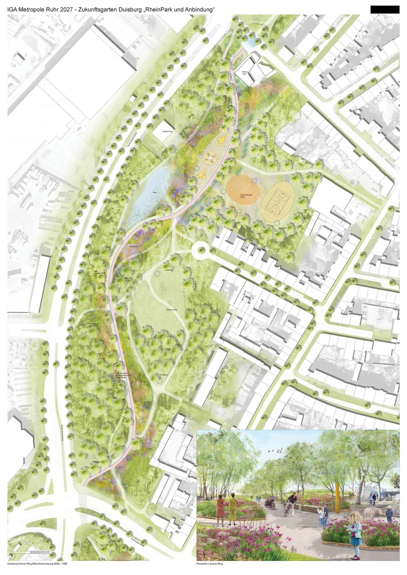 Während die Ausstellungsflächen im eintrittspflichtigen Bereich nur temporär bestehen, wird der Grüne Ring als grüne Infrastruktur für den Stadtteil Hochfeld konzipiert und von seiner früheren Funktion als Barrieregrün umgewandelt in ein durchlässiges und verbindendes Element. Neu entstehende Blumenwiesen und Staudenpflanzungen bleiben nach der IGA bestehen. Sie werten den Park visuell auf, während sie pflegeextensiv wie auch trockenheitsresistent und dadurch klimaresilient sind. Neue Platzflächen, Sportgeräte und Spielplätze vervielfältigen die Nutzungsmöglichkeiten; Bestandspflanzungen werden an einigen Stellen behutsam reduziert, um Eingangsbereiche zu öffnen. Retentionswiesen und Regenwasserspeicher ermöglichen das Einbeziehen der umliegenden Nachbarschaft in ein zukunftsgerichtetes Wassermanagement-System, in dem das Regenwasser der versiegelten Oberflächen abgeleitet, gesammelt und so in Trockenperioden für die Bewässerung der Grünflächen verfügbar wird.