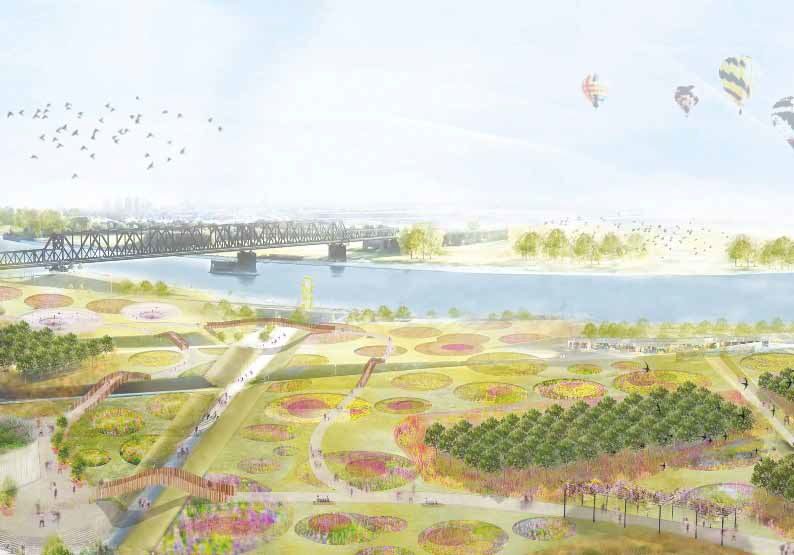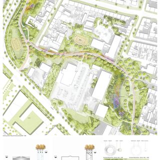 Im Rheinpark liefert die bestehende Topografie mit den markanten Wiesenschollen den Ausgangspunkt des vorliegenden Entwurfs: Der IGA-Rundweg setzt sich ganz klar über die bestehende Fragmentierung des Geländes hinweg und überbrückt diese im wahrsten Sinne des Wortes. Die Schollenoberflächen werden zu IGA-Ausstellungsflächen, die sich – in bewusstem Kontrast zu den geometrischen Formen des Parks – fantasievoll, in Kreisen und geschwungenen Feldern zwischen den bestehenden Erzbunkerwänden, dem Wasserturm, dem Skatepark und den in Blöcken angelegten Bestandsbäumen auftun. Wilde Flächen aus Gräsern und Wildblumen schaffen einen Übergang von den Blöcken der Bestandsbäume zu den Ausstellungsflächen und rahmen diese ein. Sie bieten zugleich einen Rückzugsraum für die Natur und werden während der IGA als ‚Wildnis‘ zu betrachten sein. Geschwungene und filigrane Brückenstrukturen ermöglichen einen barrierefreien Rundgang über die Schollen hinweg und erlauben es den Besuchern, den Rheinpark aus ganz neuen Perspektiven wahrzunehmen.
