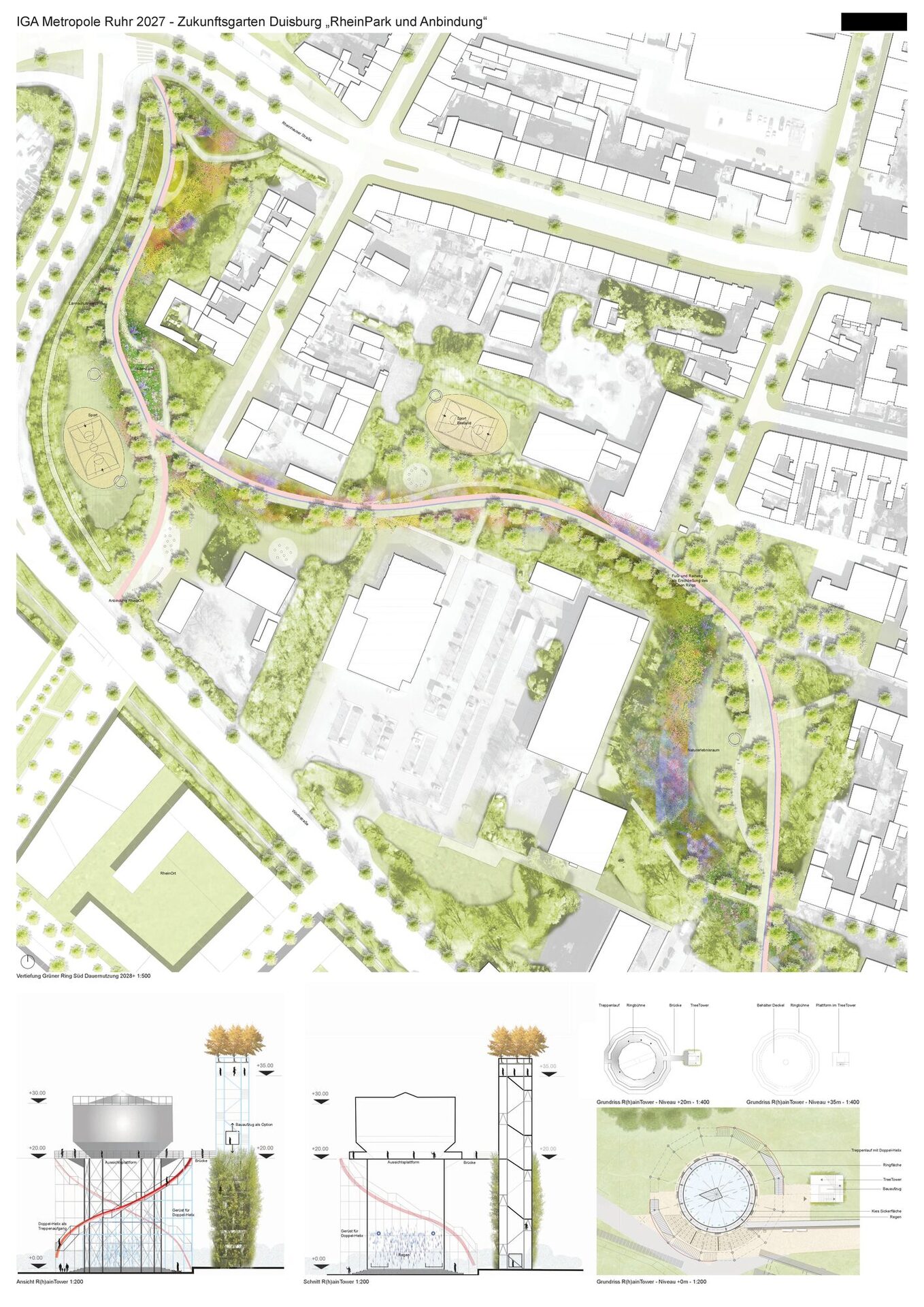 Über die bunten Wiesenschollen hinweg erblickt man den Wasserturm, der zur IGA in neuem Glanz erstrahlt. Auf einer filigranen Gerüststruktur und in respektvollem Abstand schweben zwei gegenläufige Freitreppen in Form einer Doppelhelix um das restaurierte Industriedenkmal und ermöglichen den Besuchern den Aufstieg auf die ehemalige Ringbühne in 20 m Höhe, von der man einen herrlichen Rundumblick über das gesamte Ausstellungsgelände und die Rheinufer hat. Unten, im inneren Sockelbereich des Turms, lädt eine beschauliche Wasserinstallation zum Verweilen ein: Rundum fallen aus geringer Höhe, leise und inspirierend, Regentropfen herab und erinnern assoziativ an die ursprüngliche Funktion des Turms. So wird aus dem Wasserturm ein R(h)ainTower. Unmittelbar daneben streckt sich ein schlanker Gerüst-Turm mit lebender Baubotanik in den Himmel, auf halber Höhe mit einem Übergang zur Ringbühne des Wasserturms. Mit seiner umlaufenden Treppenanlage ist der R(h)ainTower Haupt-Erschließungsstrang während des IGA-Ansturms. Darüber hinaus ermöglicht im Kern des neuen Turms ein Bauaufzug (Transportbühne für Personen und Material) es auch Menschen mit eingeschränkter Mobilität sowie Familien mit Kinderwagen, die Aussichtsplattform auf dem Wasserturm zu erreichen. Der Aufzug ist nur als temporäre Installation für die IGA Ausstellung geplant, kann aber je nach Bedarf in der Dauernutzung geöffnet werden – z.B. an Wochenenden. Das gleiche gilt für die Gerüststruktur um den alten Wasserturm, wodurch der Stadt auf lange Sicht alle Optionen einer Weiternutzung offenstehen.