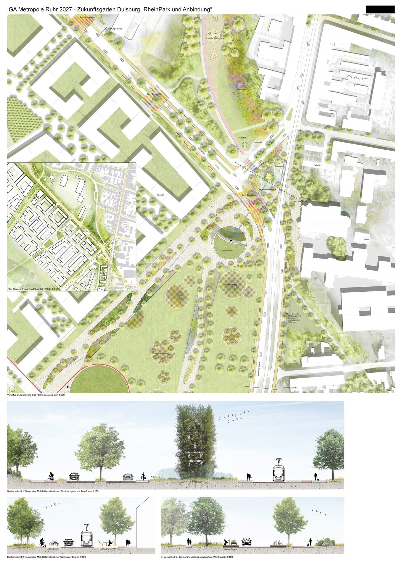 Vom Bonifatiusplatz aus entlang der Achse RheinOrt geht es am ScienceCenter vorbei auf den IGA- Haupteingang zu. Hier ist das Ausstellungsgelände noch nicht eintrittspflichtig und die Flächen, auf denen später der RheinOrt entstehen wird, werden für Duisburger*innen als Zukunftsgarten geöffnet. Auf Experimentierfeldern werden nachhaltige Stadtbegrünungskonzepte (z.B. pflegeextensive Blumenwiesen) getestet und die Bürger*innen dazu eingeladen, schon im Vorlauf der IGA – ganz im Sinne des Leitgedankens Zukunftsgärten / Unsere Gärten / Mein Garten – selbst Hand anzulegen. So können hier entlang der Wanheimer Straße und gegenüber dem bestehenden Kleingartenverein etwa ungenutzte Flächen für Urban Gardening zur Verfügung gestellt werden.