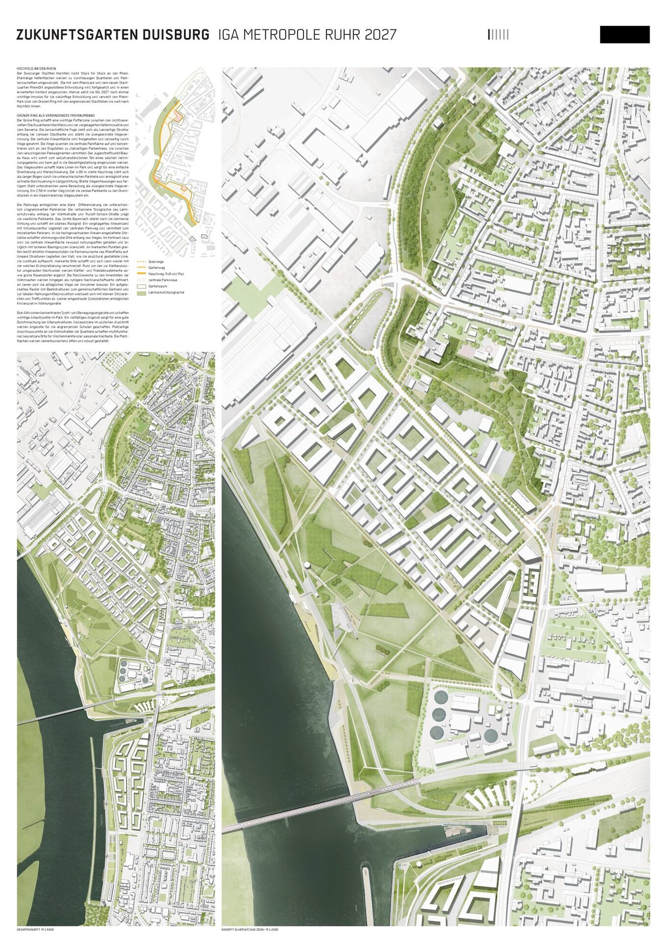 Der Duisburger Stadtteil Hochfeld rückt Stück für Stück an den Rhein. Ehemalige Hafenflächen werden zu durchlässigen Quartieren und Parklandschaften umgewandelt. Die mit dem RheinPark und dem neuen Stadtquartier RheinOrt angestoßene Entwicklung wird fortgesetzt und in einen erweiterten Kontext eingebunden. Hierbei setzt die IGA 2027 noch einmal wichtige Impulse für die zukünftige Entwicklung und verwebt den Rhein- Park über den Grünen Ring mit den angrenzenden Stadtteilen bis weit nach Hochfeld hinein.