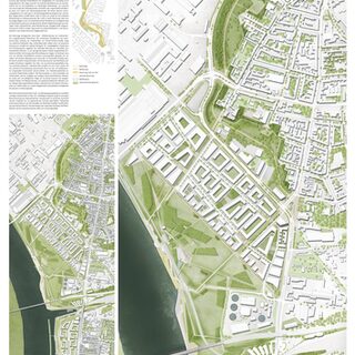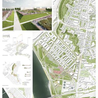 Das neue Stadtquartier auf den ehemaligen Flächen der ALGA GmbH orientiert sich in seiner Typologie und Körnung an dem Quartier RheinOrt und sorgt für eine gestalterische Kontinuität. Büros und nicht störendes Gewerbe sorgen für einen schrittweisen Transformationsprozess hin zu dienstleistungsorientierten Nutzungen, die eine öffentlichkeitswirksamere Bespielung der Uferzonen zulassen, ergänzt um punktuelle Wohnnutzungen. Parkfinger verlängern die Wegeachsen aus den Bestandsquartieren über die Industriegleise bis in den Südhafen. Uferplätze betonen die Endpunkte und Schwimmplattformen lassen einen direkt an die Wasserkante herantreten. Eine filigrane Fußgängerbrücke ermöglicht den Sprung über den Südhafen und schafft einen Rundweg über die Hafenmole mit Aussichtsbalkonen auf das weite Rheinpanorama.