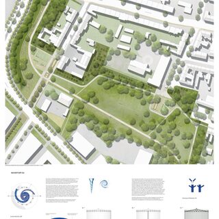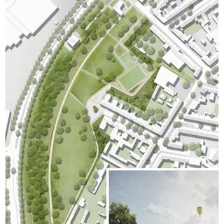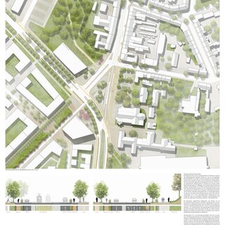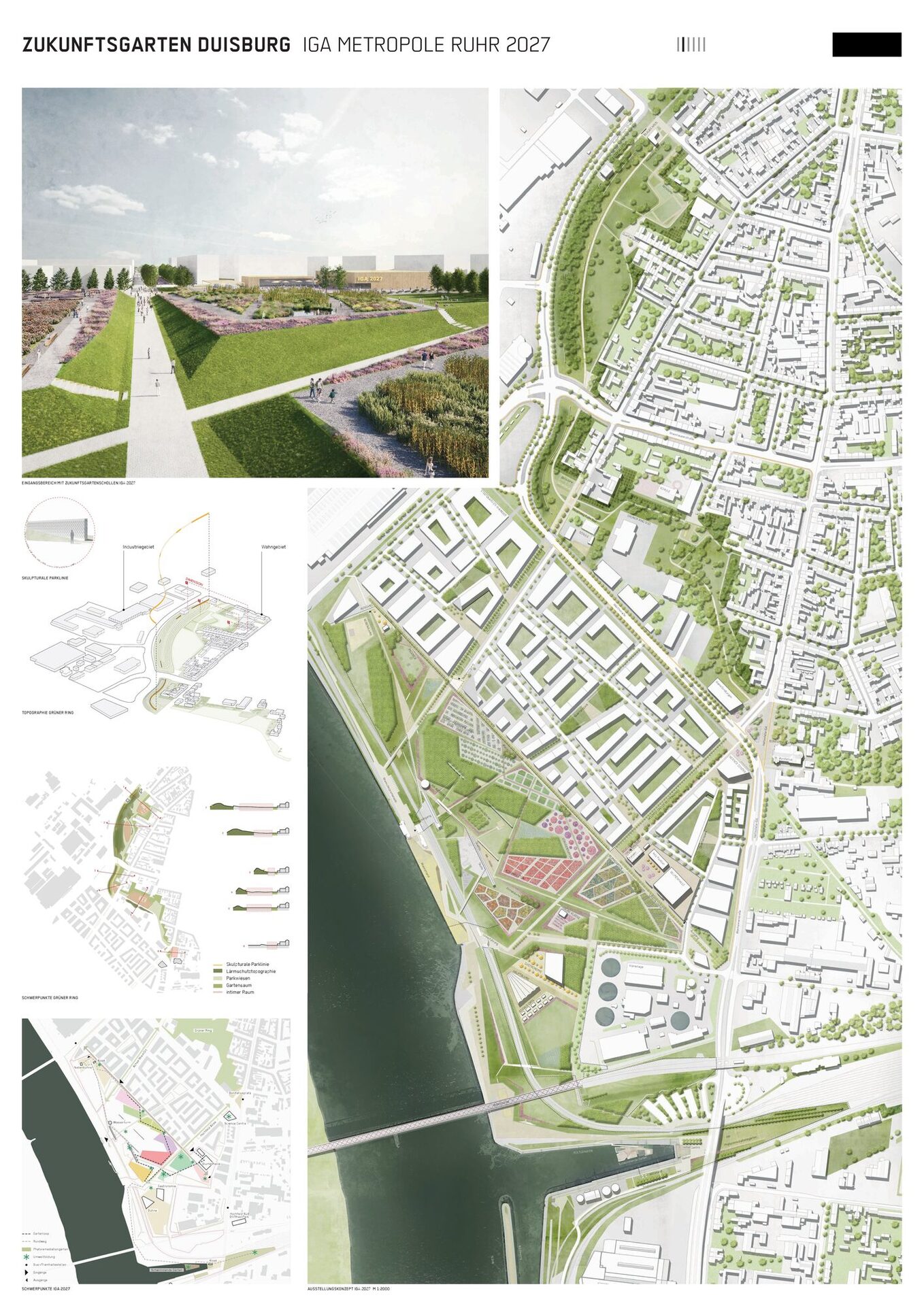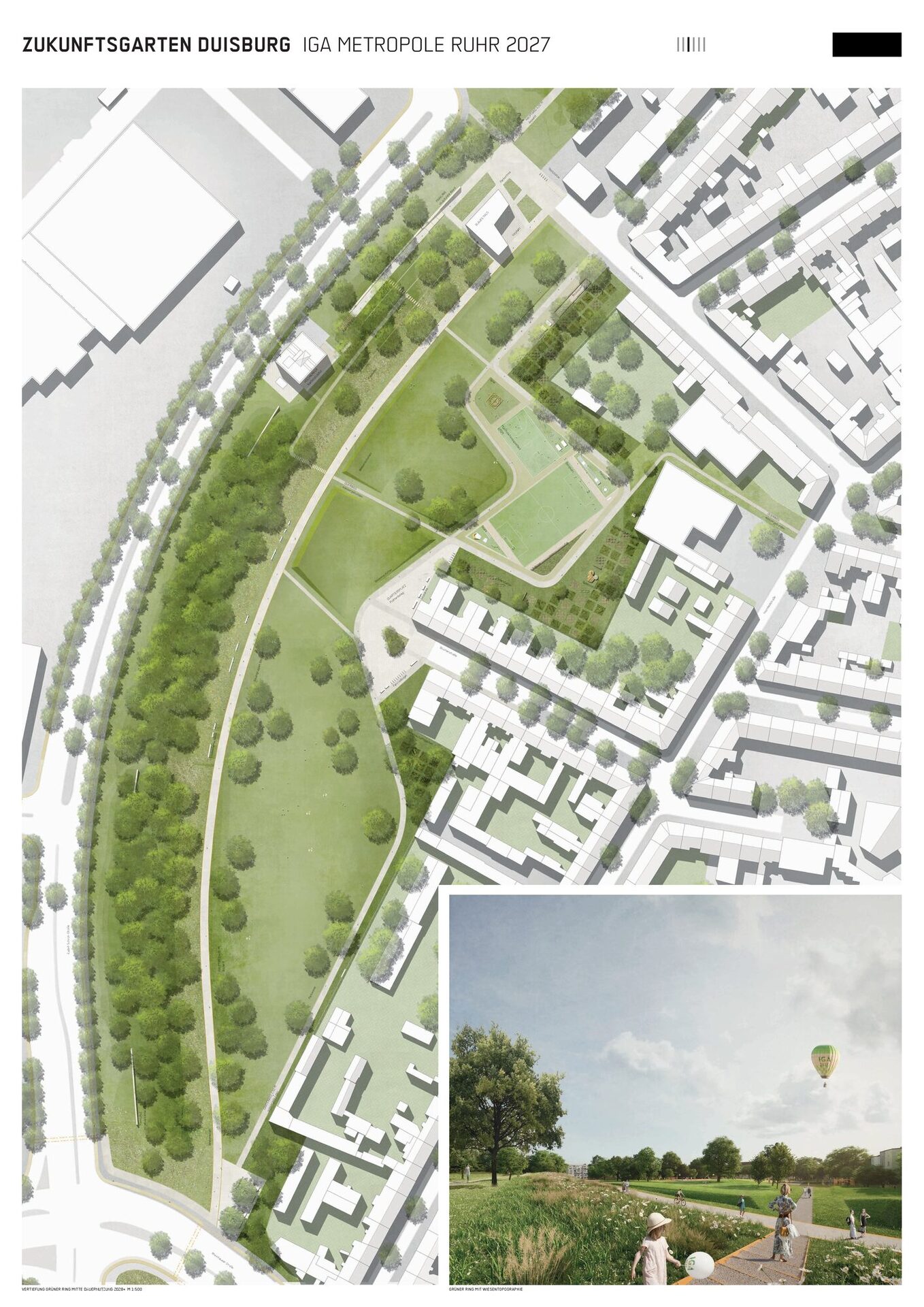 Die Verfassenden haben die besonderen Herausforderungen, die sich an die neu zu gestaltenden Freiräumen in Hochfeld stellen, erkannt und schlagen als Leitidee für den Grünen Ring eine vor Lärmimmissionen geschützte Parkanlage vor, in dem sie mit der Topografie arbeiten und sie skulptural gestalten. So entwickeln sie zur Rudolf- Schock-Straße einen dicht begrünten Lärmschutzwall. Die damit verbundene Lärmschutzmauer wird jedoch kritisch gesehen. Mitten durch den Park führt als Rückgrat ein prägnanter Hauptweg bis zum Bonifatiusplatz. Von dieser vier Meter breiten Hauptachse gehen schmalere Wege in die Siedlung und gliedern unterschiedliche Funktionsräume, die eine hohe Nutzungsvielfalt für das neue grüne Herz von Hochfeld anbieten. Zu diesen ganz unterschiedlich programmierten Parkrandbereichen werden partiell konkrete Aussagen gemacht, womit sich einerseits die Chance ergibt, die Bevölkerung in die Gestaltung und Ausstattung einzubeziehen, anderseits bleiben einige Fragen zur Gestalt und Funktion unbeantwortet.