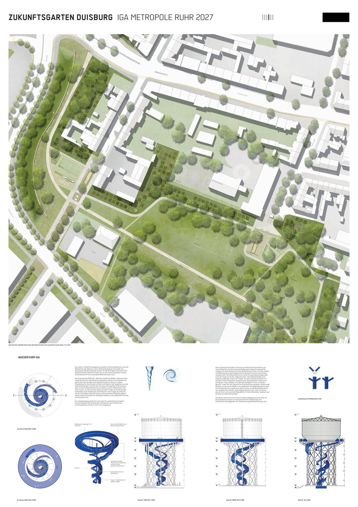 Das Duisburg’sche Motto der „Stadt der Vielfalt am Wasser“ ebenso wie den ursprünglichen Sinn des Bauwerks aufgreifend, stellen wir das Wasser und damit verbunden die Idee eines Wasserstrudels ins Zentrum unseres Projektentwurfs. Das Konzept orientiert sich dabei an der Doppelhelix aus der Machbarkeitsstudie, erinnert aber durch seine einzigartige Ausformung vor allem an einen Wasserstrudel, der sinnbildlich aus dem Wassertank in die Tiefe rauscht. So soll nach dem Abbau der alten Treppe die strudelförmige Konstruktion einer Stahltreppe samt Rutsche in das Traggerüst integriert werden. Die stählerne Röhrenrutsche ist als besonderes Highlight geplant, dessen Erlebnischarakter ein vielfältiges Publikum und insbesondere auch Familien anziehen wird. Der Treppenaufgang weitet sich nach oben hin systematisch mit jedem weiteren Segment des bestehenden Stahlgerüsts. Die erforderlichen Zwischenpodeste sind darin harmonisch eingepasst.