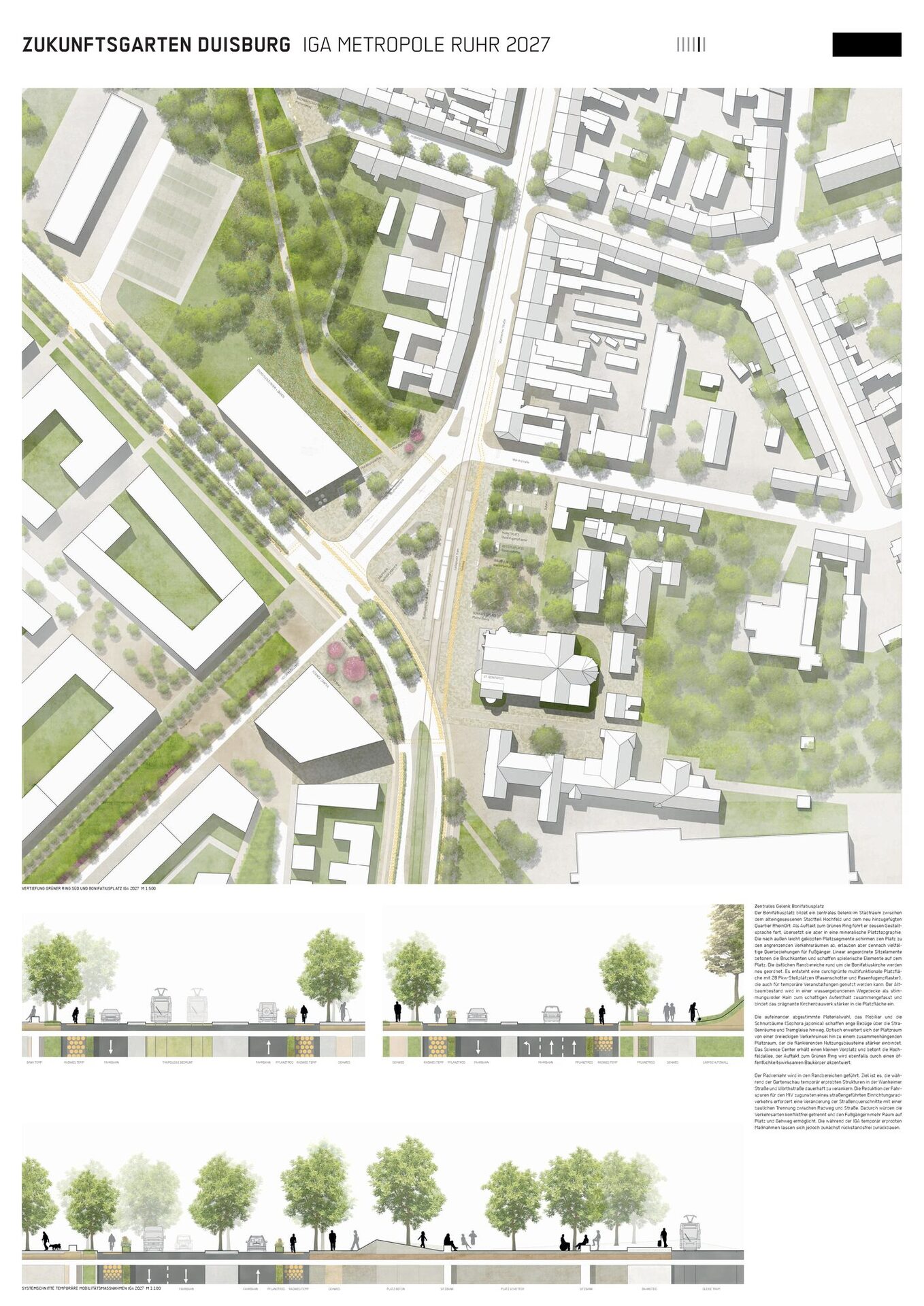 Der Bonifatiusplatz bildet ein zentrales Gelenk im Stadtraum zwischen dem alteingesessenen Stadtteil Hochfeld und dem neu hinzugefügten Quartier RheinOrt. Als Auftakt zum Grünen Ring führt er dessen Gestaltsprache fort, übersetzt sie aber in eine mineralische Platztopgraphie. Die nach außen leicht gekippten Platzsegmente schirmen den Platz zu den angrenzenden Verkehrsräumen ab, erlauben aber dennoch vielfältige Querbeziehungen für Fußgänger. Linear angeordnete Sitzelemente betonen die Bruchkanten und schaffen spielerische Elemente auf dem Platz. Die östlichen Randbereiche rund um die Bonifatiuskirche werden neu geordnet. Es entsteht eine durchgrünte multifunktionale Platzfläche mit 28 Pkw-Stellplätzen (Rasenschotter und Rasenfugenpflaster), die auch für temporäre Veranstaltungen genutzt werden kann. Der Altbaumbestand wird in einer wassergebundenen Wegedecke als stimmungsvoller Hain zum schattigen Aufenthalt zusammengefasst und bindet das prägnante Kirchenbauwerk stärker in die Platzfläche ein.