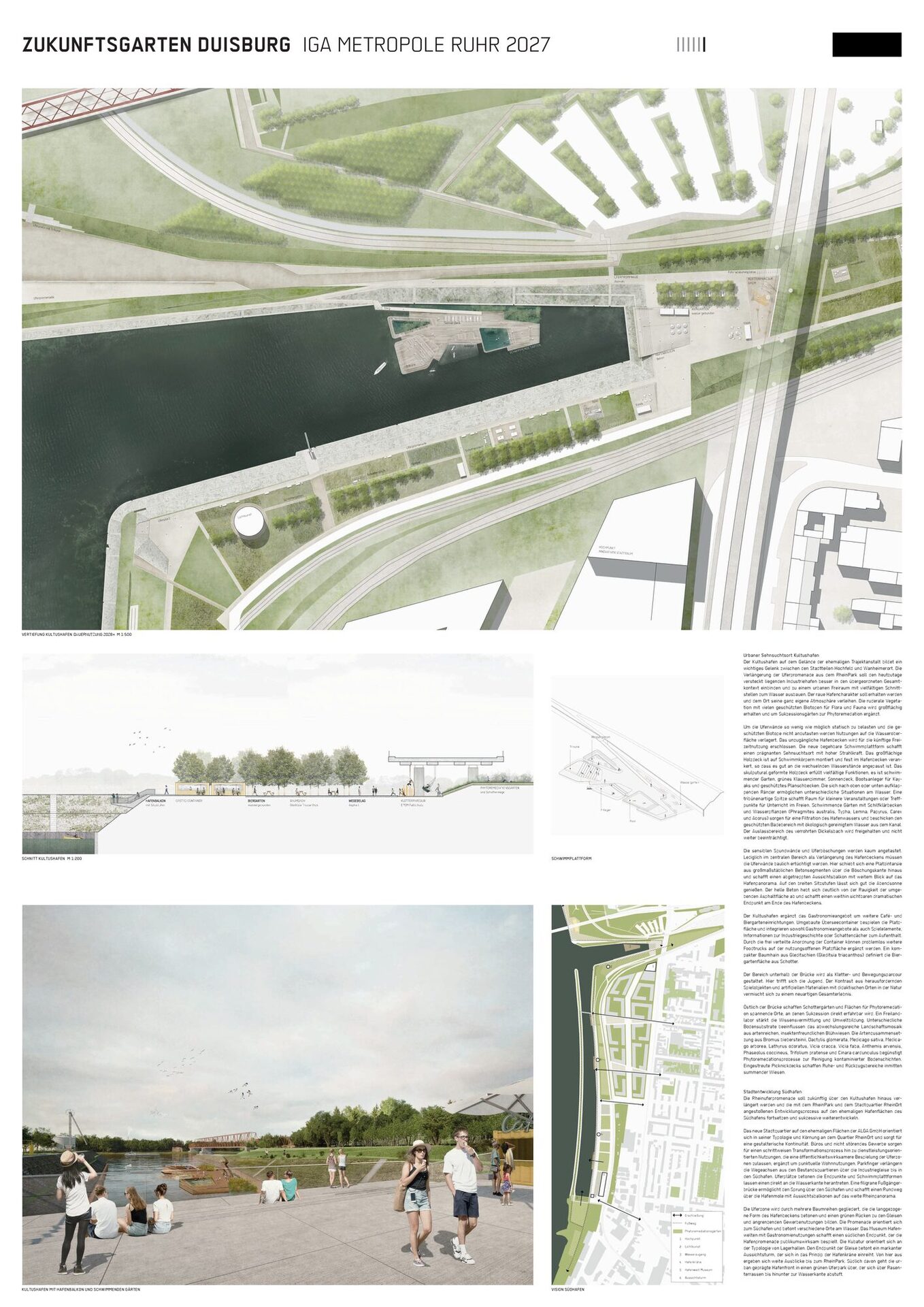 Um die Uferwände so wenig wie möglich statisch zu belasten und die geschützten Biotope nicht anzutasten werden Nutzungen auf die Wasseroberfläche verlagert. Das unzugängliche Hafenbecken wird für die künftige Freizeitnutzung erschlossen. Die neue begehbare Schwimmplattform schafft einen prägnanten Sehnsuchtsort mit hoher Strahlkraft. Das großflächige Holzdeck ist auf Schwimmkörpern montiert und fest im Hafenbecken verankert, so dass es gut an die wechselnden Wasserstände angepasst ist. Das skulputural geformte Holzdeck erfüllt vielfältige Funktionen, es ist schwimmender Garten, grünes Klassenzimmer, Sonnendeck, Bootsanleger für Kayaks und geschütztes Planschbecken. Die sich nach oben oder unten aufklappenden Ränder ermöglichen unterschiedliche Situationen am Wasser. Eine tribünenartige Spitze schafft Raum für kleinere Veranstaltungen oder Treffpunkte für Unterricht im Freien. Schwimmende Gärten mit Schilfklärbecken und Wasserpflanzen (Phragmites australis, Typha, Lemna, Papyrus, Carex und Acorus) sorgen für eine Filtration des Hafenwassers und beschicken den geschützten Badebereich mit ökologisch gereinigtem Wasser aus dem Kanal. Der Auslassbereich des verrohrten Dickelsbach wird freigehalten und nicht weiter beeinträchtigt.