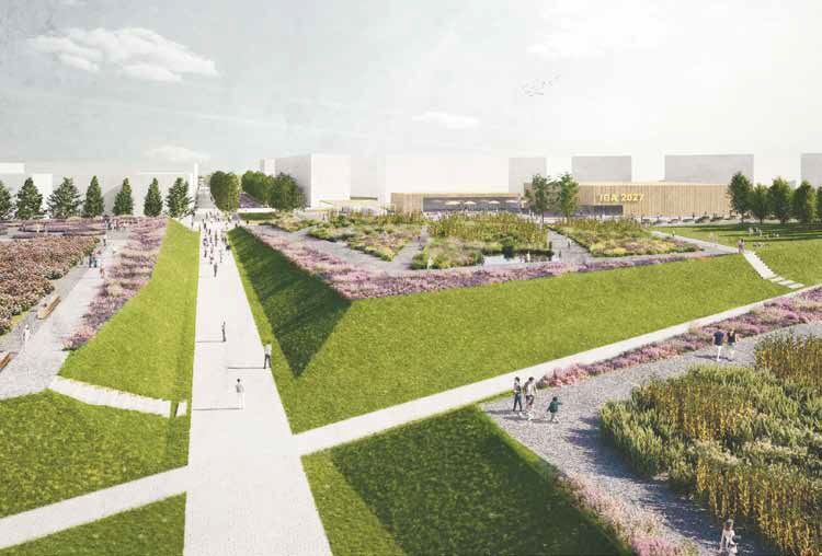 Der Haupteingang an der Hochfeldallee empfängt die IGA-Besucher mit einer großzügigen Platzfläche auf zukünftigem Bauland. Er bindet das Ensemble aus Kassen, Info-Pavillon und Blumenhalle ein und schafft einen wichtigen Fokuspunkt. Die Blumenhalle entfernt sich stärker von klassischen Leistungsschauen hin zu experimentellen Indoor-Gärten und steht damit in engem Dialog mit den Zukunftsthemen des Science Centers. Die Klimagärten schaffen den ersten Baustein im Gartenschaugelände. Hier werden zukunftweisende Themen wie Wassermanagement, Phytoremedation, Klimaresilienz und Artenvielfalt präsentiert. Das Thema Nachhaltigkeit zieht sich als übergeordnetes Thema durch sämtliche Ausstellungsinhalte und schafft einen eigenständigen Erzählstrang. Die zentrale Veranstaltungsbühne und Hauptgastronomie werden auf dem Plateau unterhalb der Bahnbrücke platziert. Weitere Gastronomiestandorte und Nebenbühnen verteilen sich über das Gesamtgelände und schaffen individuelle Orte.