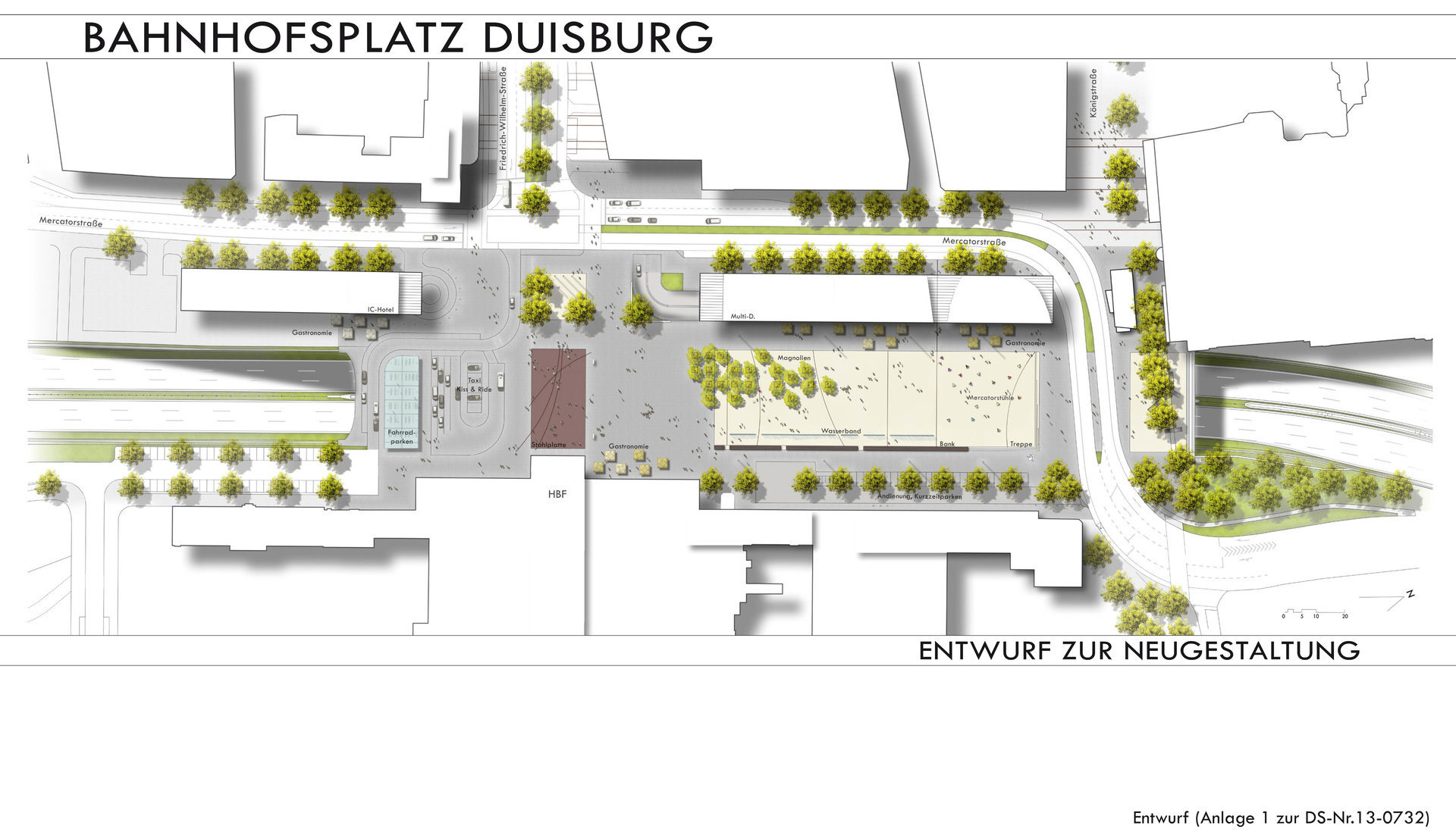 Zahlreiche Vorschläge von Bürgerinnen und Bürgern für diese Duisburg angemessene Identität des Platzes wurden im Entwurf umgesetzt. Darunter Elemente wie (Sitz-) Mobiliar, Wasserspiele, Kunstobjekte werden zu wesentlichen identitätsstiftenden und Duisburg repräsentierenden Merkmalen des neuen Bahnhofsplatzes.