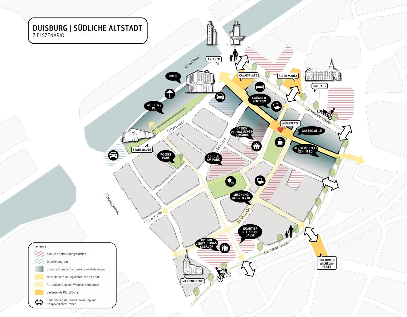 Im Kern wurde eine Kombination der Szenarien 1 und 2 vorgenommen, die die griffigsten Ansätze beinhalten. Neben dem Ansatz historische Strukturen und Atmosphären aufzugreifen und wiederherzustellen, soll der Anteil wohnungsnaher Grünflächen erhöht und qualifiziert werden. Die Münzstraße wird als qualitätsvoller Stadtraum entwickelt, der durch ein Nutzungsprofil aus Klein- und Gastgewerbe, Gastronomie und Tourismus sowie vereinzeltem Einzelhandel im Erdgeschoss belebt wird. Der Münzplatz wird als Bindeglied zwischen dem Innenhafen und der angrenzenden Innenstadt als Herzstück qualifiziert und städtebaulich neu gefasst. Bestehende Zäsuren werden zurückgebaut und wichtige, teils historische Wegeverbindungen aufgegriffen und neu interpretiert.
