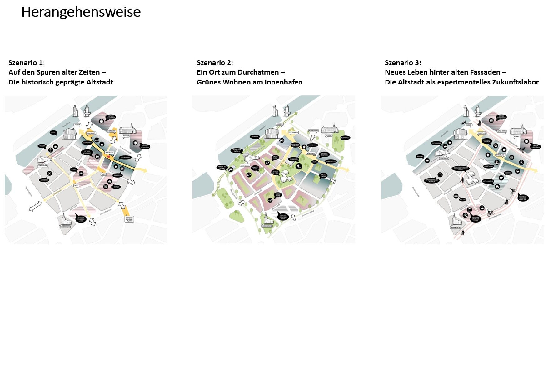 Aus den Erkenntnissen der Analyse sowie aus der dargestellten Bedarfs- bzw. Nachfragesituation für die Altstadt wurden anschließend drei Szenarien entwickelt (S. 37-47). Mit der Szenariomethode wurde angestrebt, mehr als eine mögliche Zukunft für die Entwicklung der Duisburger Altstadt zu entwerfen und diese teils gegensätzlichen Szenarien zur öffentlichen Diskussion zu stellen.