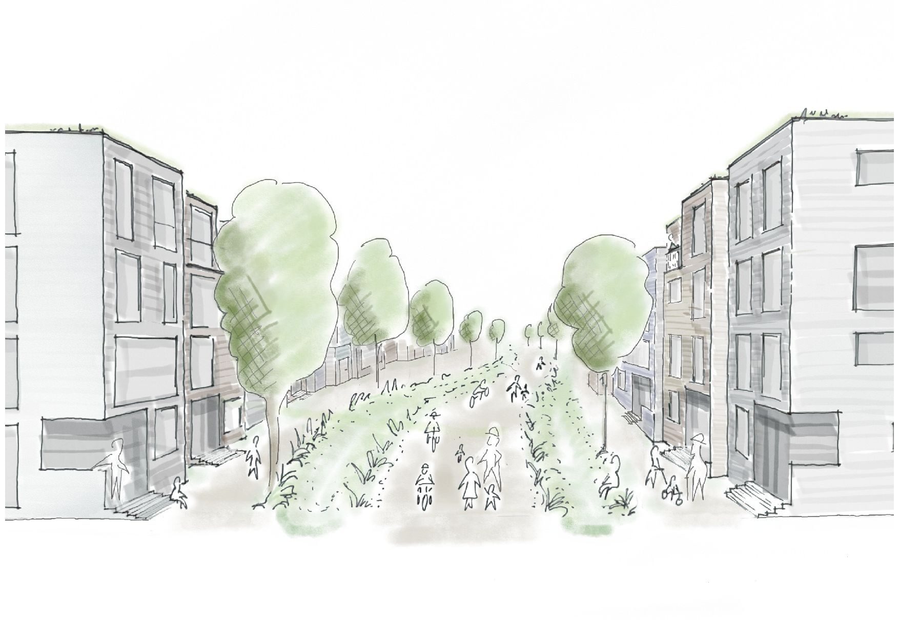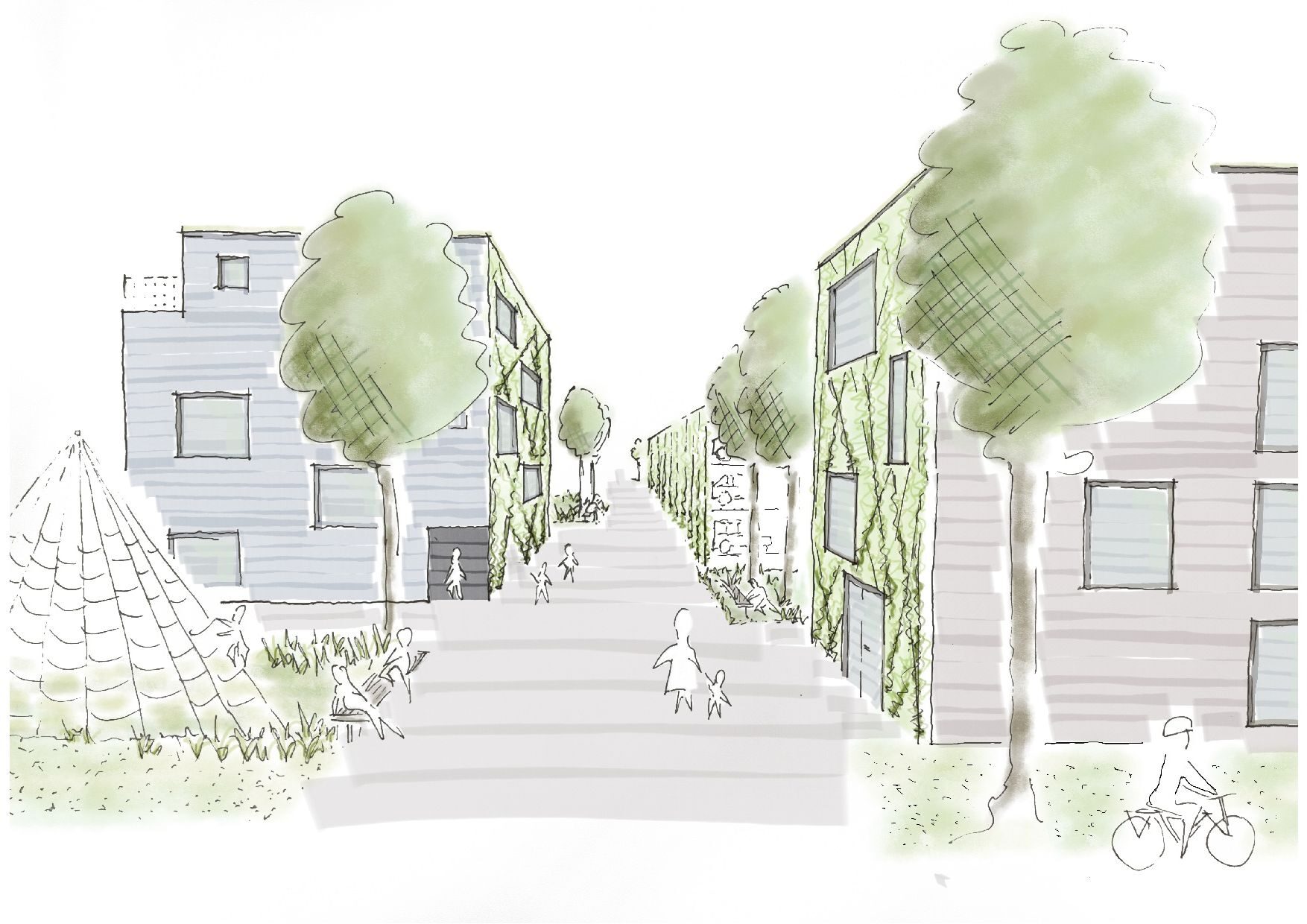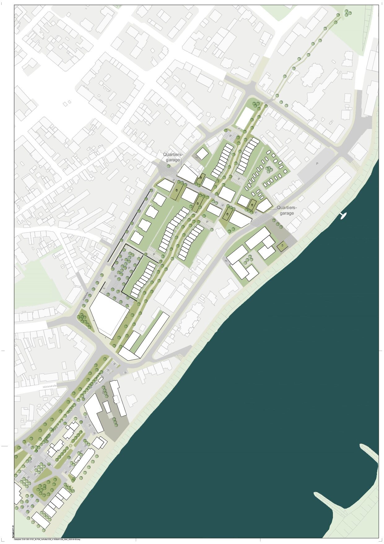 Entlang der Trajekt-Promenade, die als autofreier, grüner Bewegungs- und Aufenthaltsraum konzipiert ist, entstehen Wohnbauflächen für Townhouses. Die geschwungene, parallel zum Fluss liegende Bebauungsstruktur wird durch zwei Querverbindungen Richtung Rhein gegliedert, welche die wassernahe Lage für Alt-Homberg erlebbar machen werden. Die Querverbindungen sind mit Gastronomie, Versorgung und Spielplätzen als urbane, belebte öffentliche Räume für Aufenthalt und Bewegung gedacht und ergänzen das flächig grüne Band der Trajekt-Promenade durch vertikales Grün an Fassaden und durch Bepflanzung.