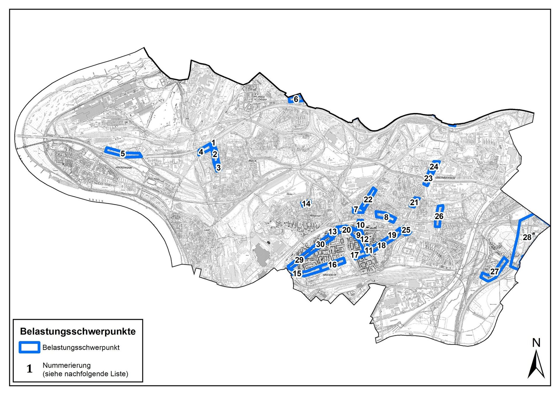 Hier sehen Sie alle Belastungsschwerpunkte des Bezirks Meiderich-Beck und deren Plannummern. In der nachfolgenden Tabelle wird unter den jeweiligen Plannummer noch einmal der genaue Straßenabschnitt aufgezeigt.