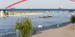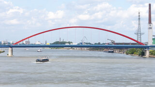 Die Brücke der Solidarität verbindet die Stadtteile Rheinhausen und Hochfeld. Der Stabbogen besitzt mit 255,9 Meter die größte Stützweite in Deutschland.